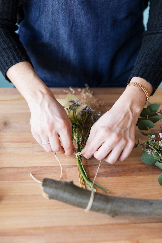 Ahora toca uno de los momentos más importantes, colgar los ramos. Colócalos mirando hacia al suelo y mide cuánta distancia quieres dejar entre ramo y palo. Te recomendamos que ates primero la cuerda al palo y luego a la punta del tallo. Así te será mucho más fácil.