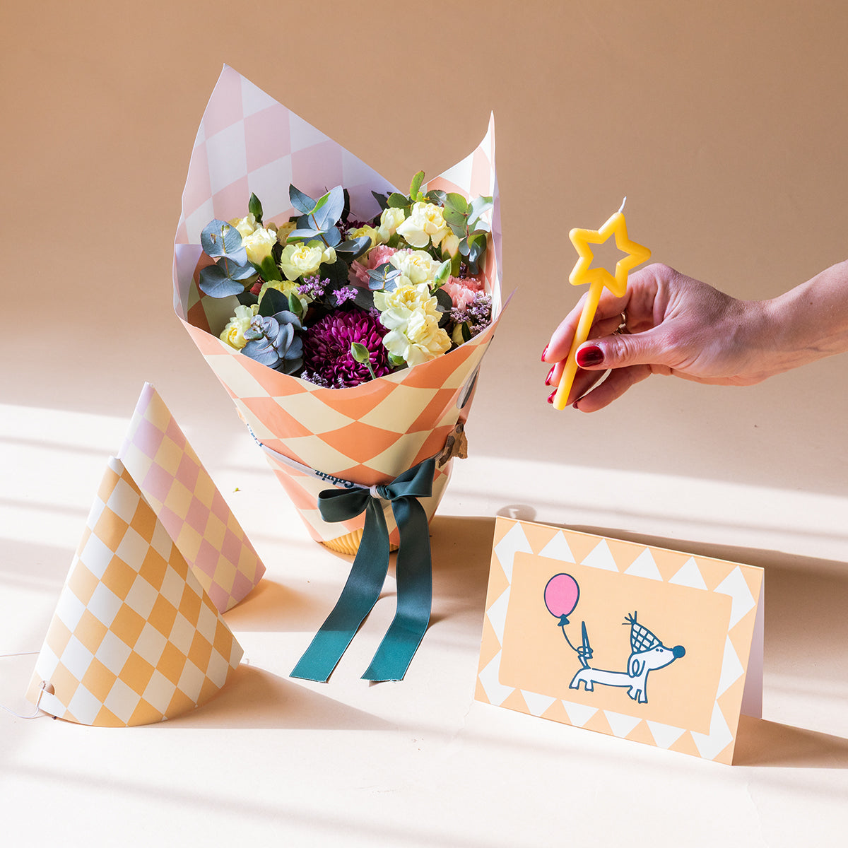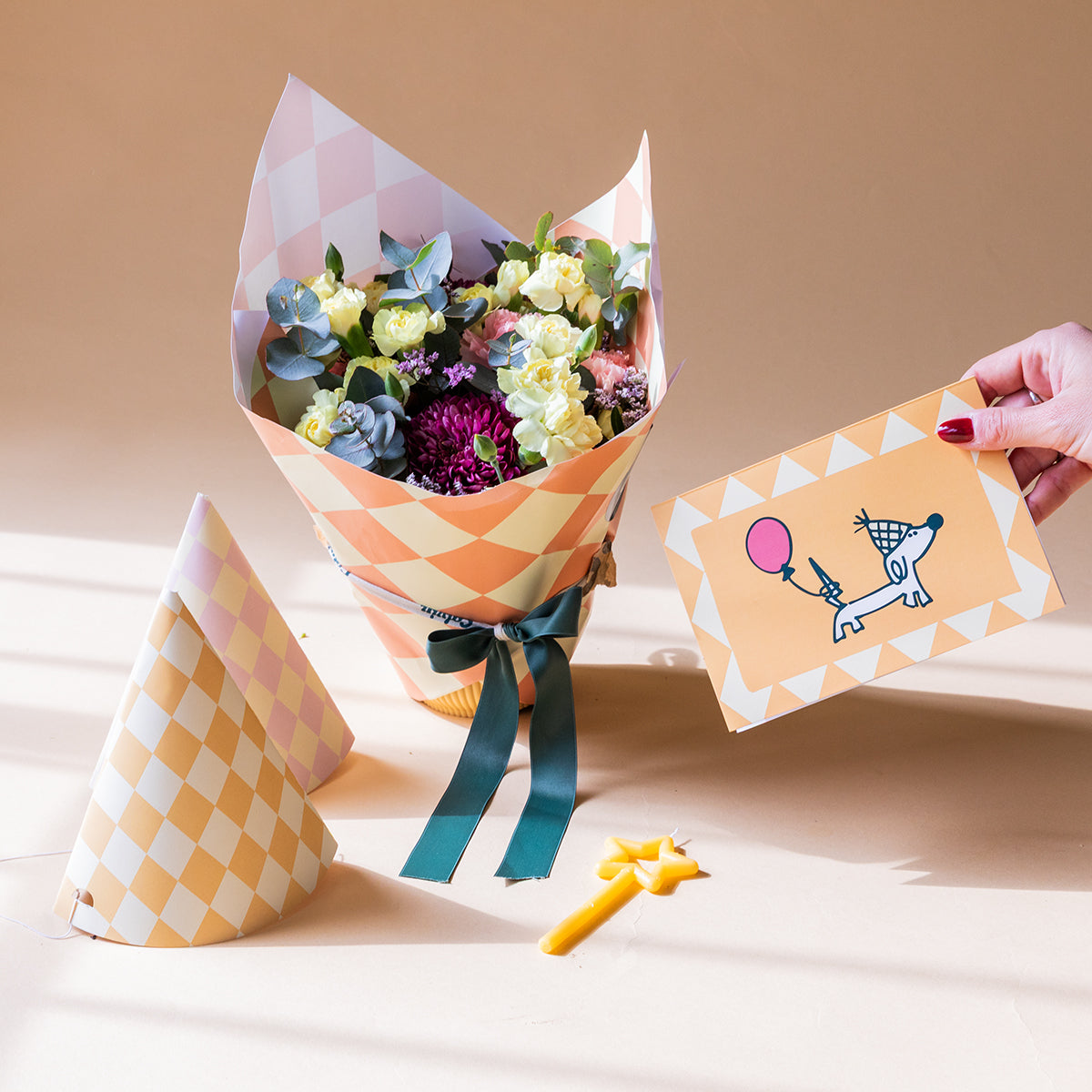 Arreglo de Flores con Envoltorio, Gorros de fiesta, Vela y Tarjeta