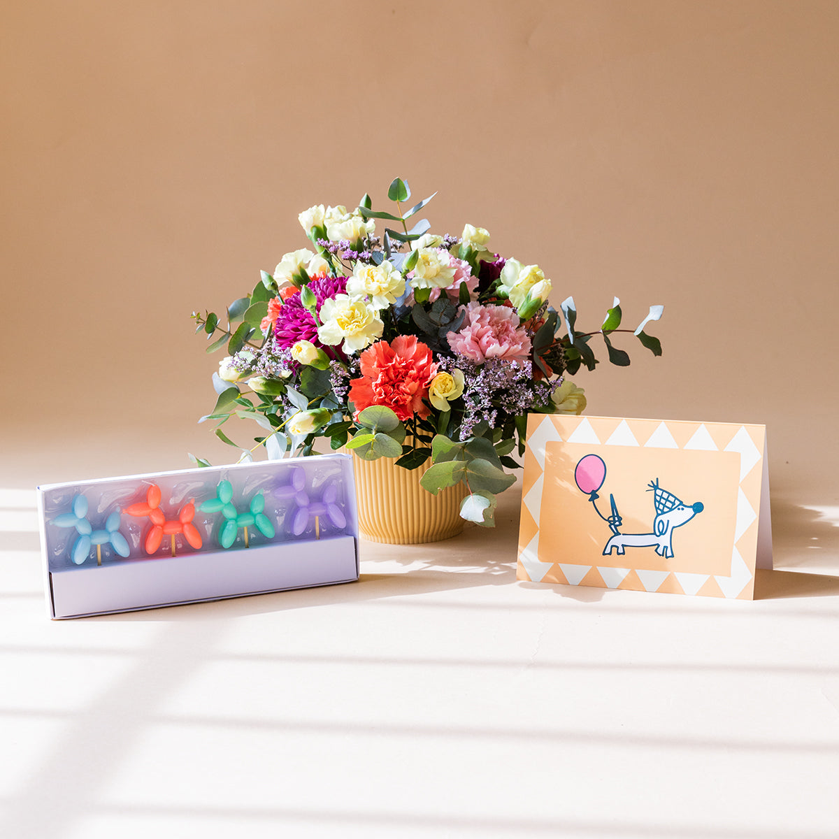 Hay gestos que llenan de alegría cada año. Este pack combina nuestro arreglo de flores más colorido con el toque divertido de nuestras velas con forma de perrito de globo, completado con una tarjeta a juego donde tus palabras serán el mejor recuerdo.