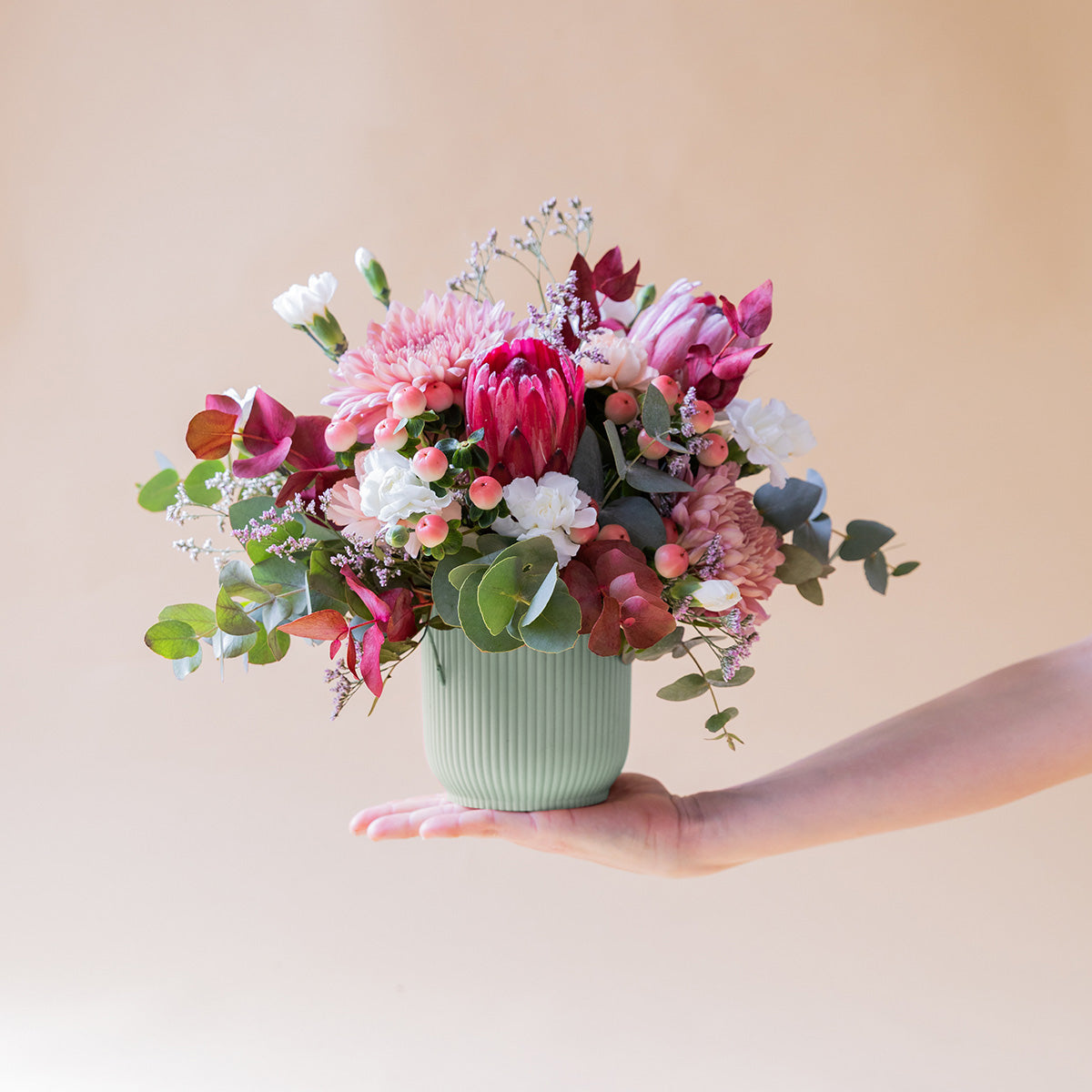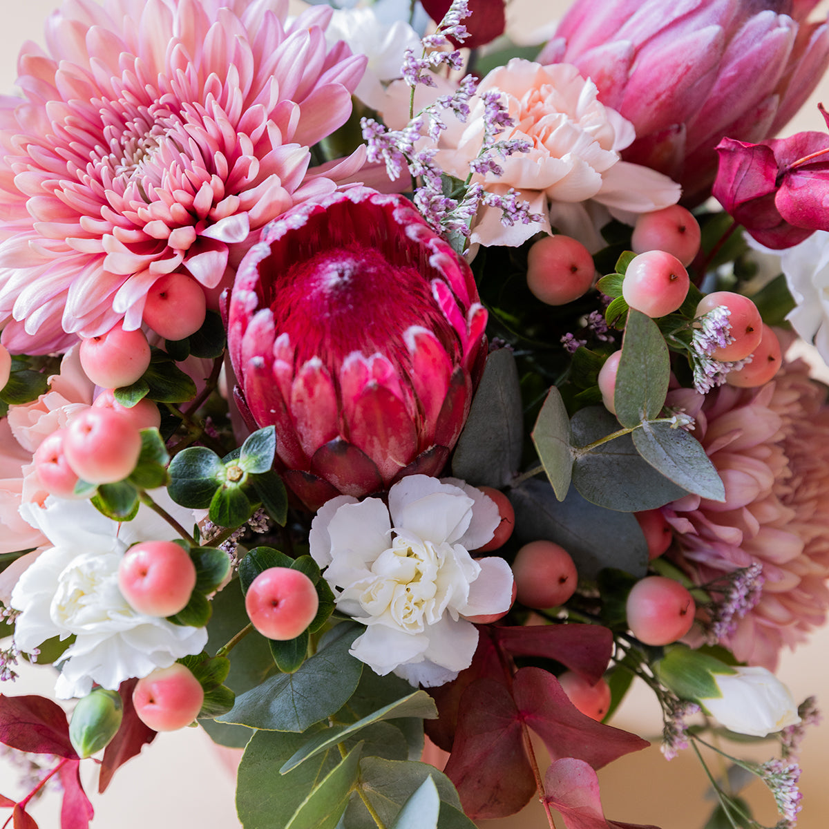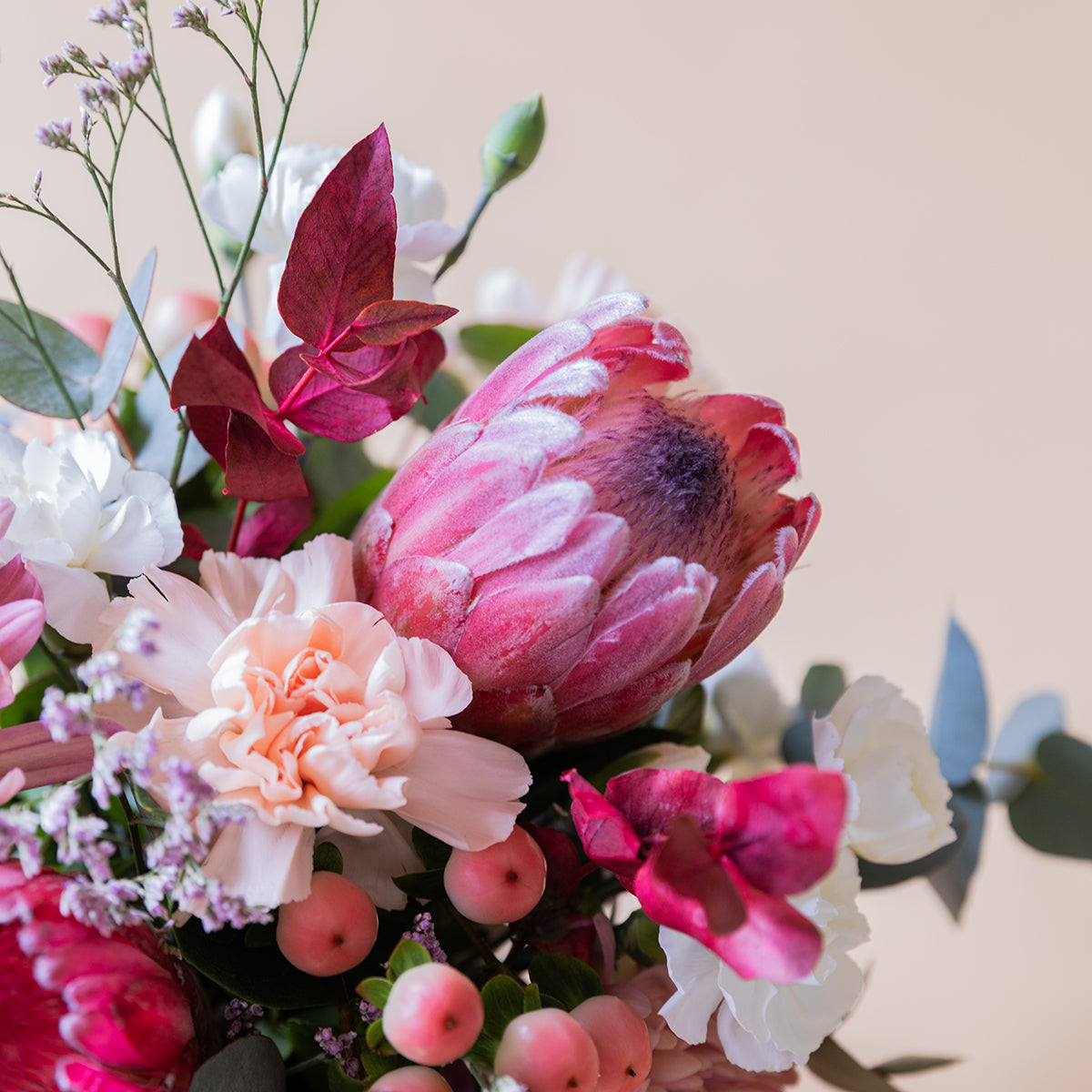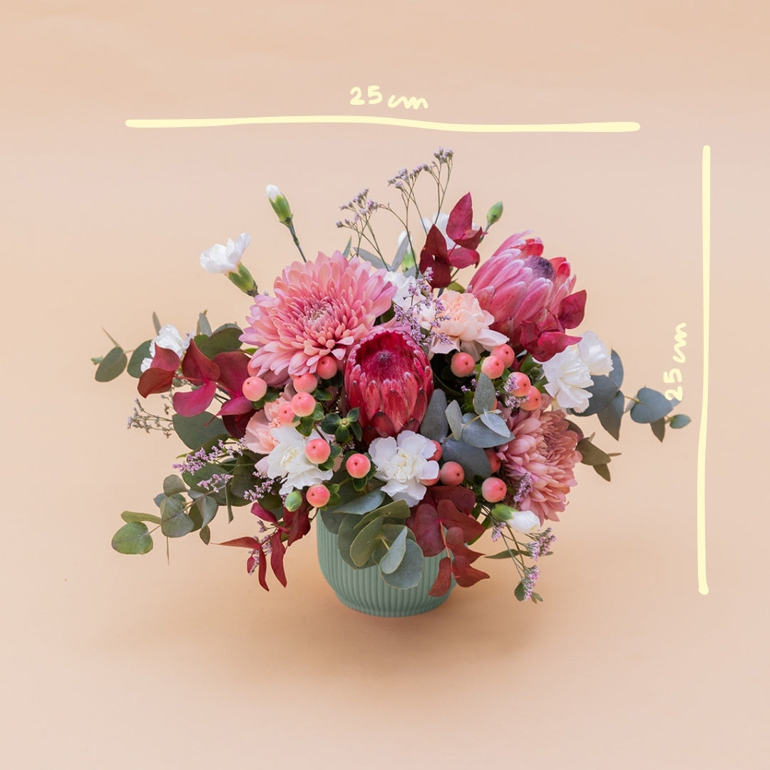 El Prota es nuestro arreglo más atrevido: construido alrededor de la protea, una flor que no pide permiso para entrar en una habitación. Al ser un diseño de la casa, adaptamos el resto de flores a la temporada para que dure al máximo, pero ese carácter tan protagonista se mantiene intacto.