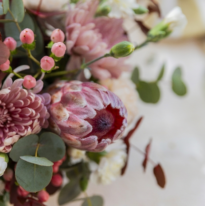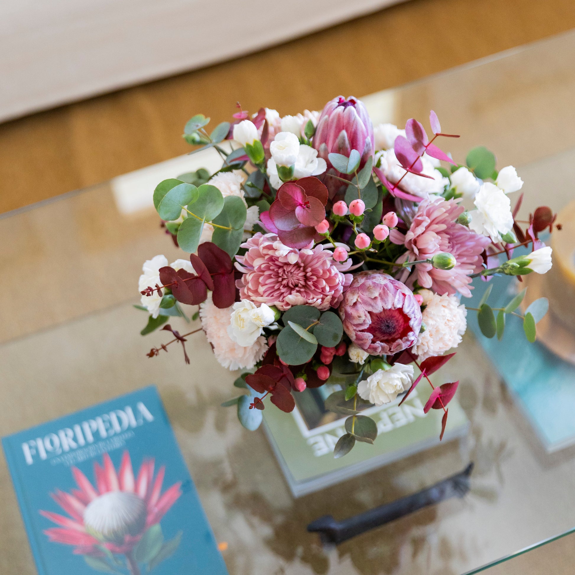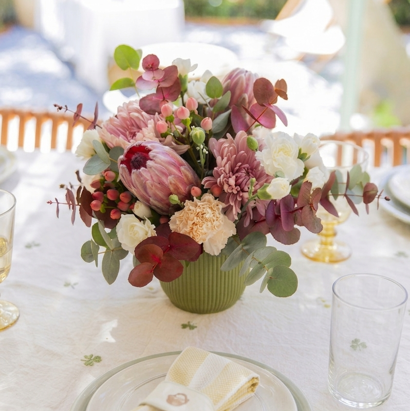 El Prota es nuestro arreglo más atrevido: construido alrededor de la protea, una flor que no pide permiso para entrar en una habitación. Al ser un diseño de la casa, adaptamos el resto de flores a la temporada para que dure al máximo, pero ese carácter tan protagonista se mantiene intacto.