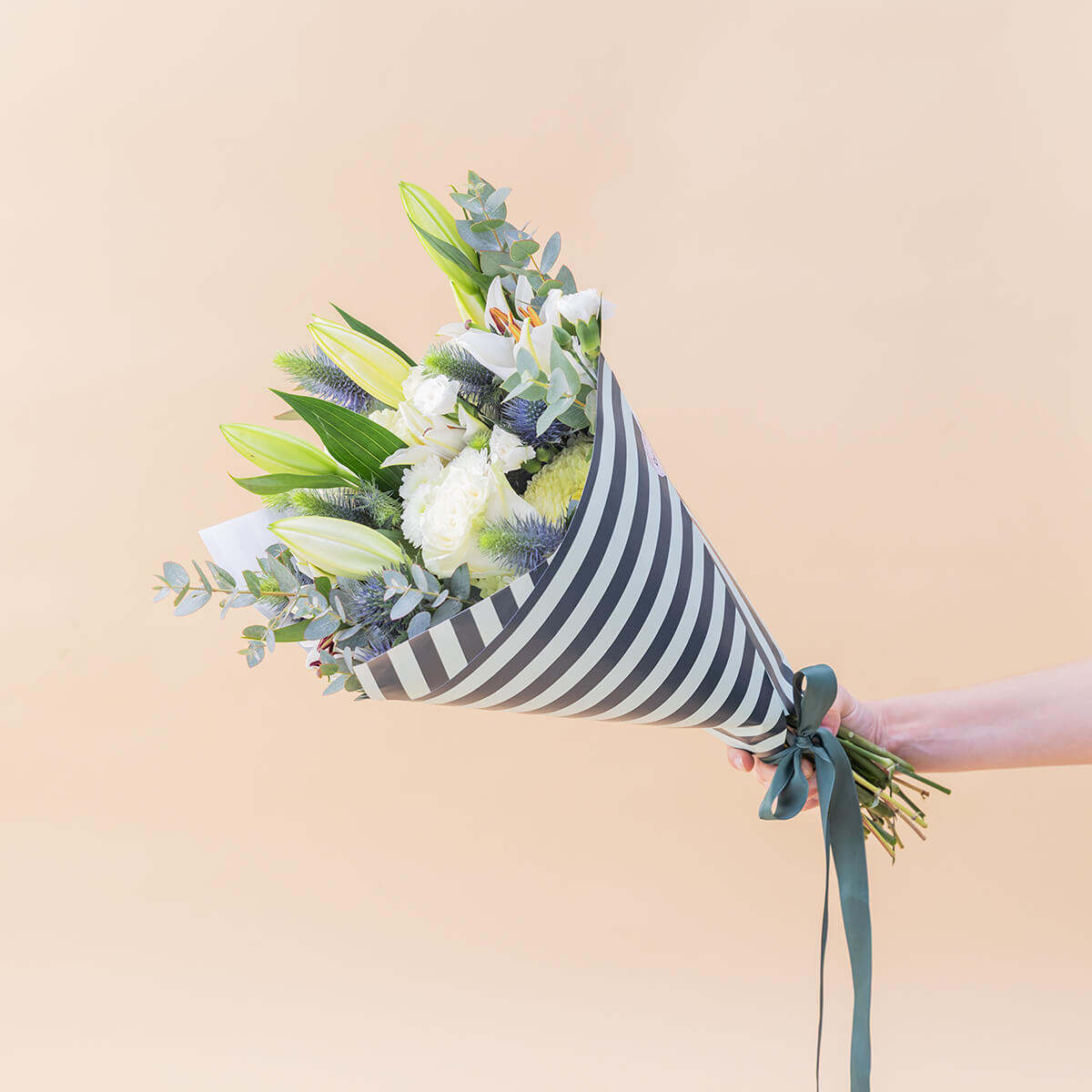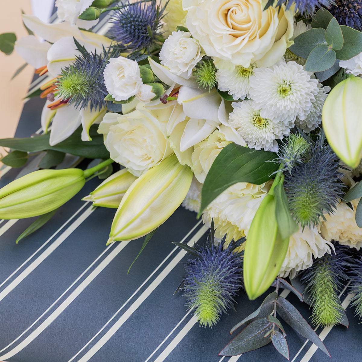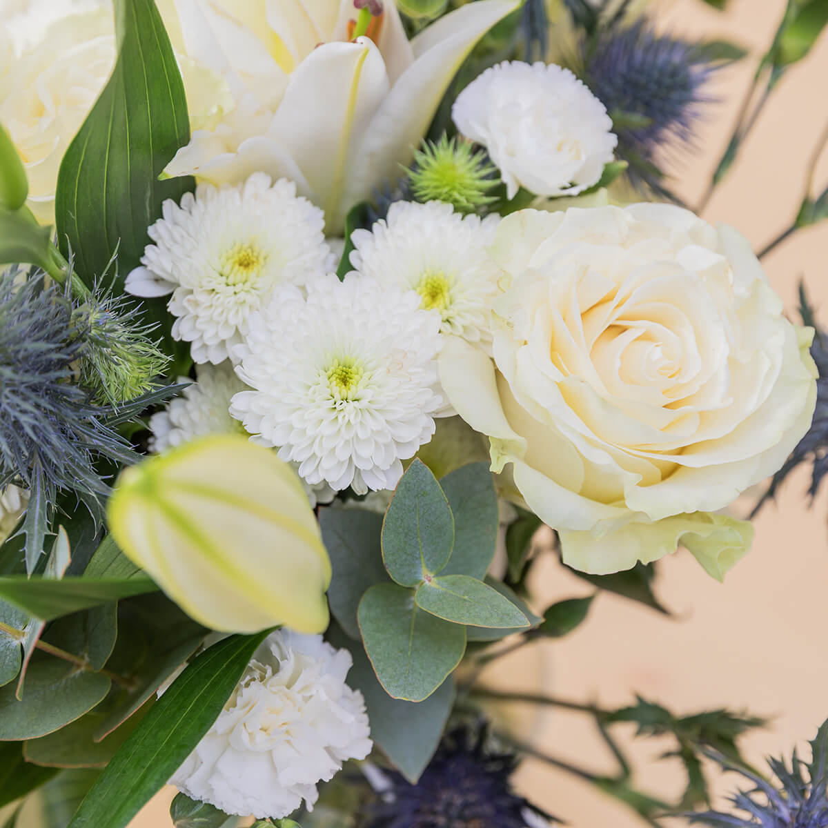 Imagina abrir la caja y encontrar un ramo blanco, elegante, que transmite paz.