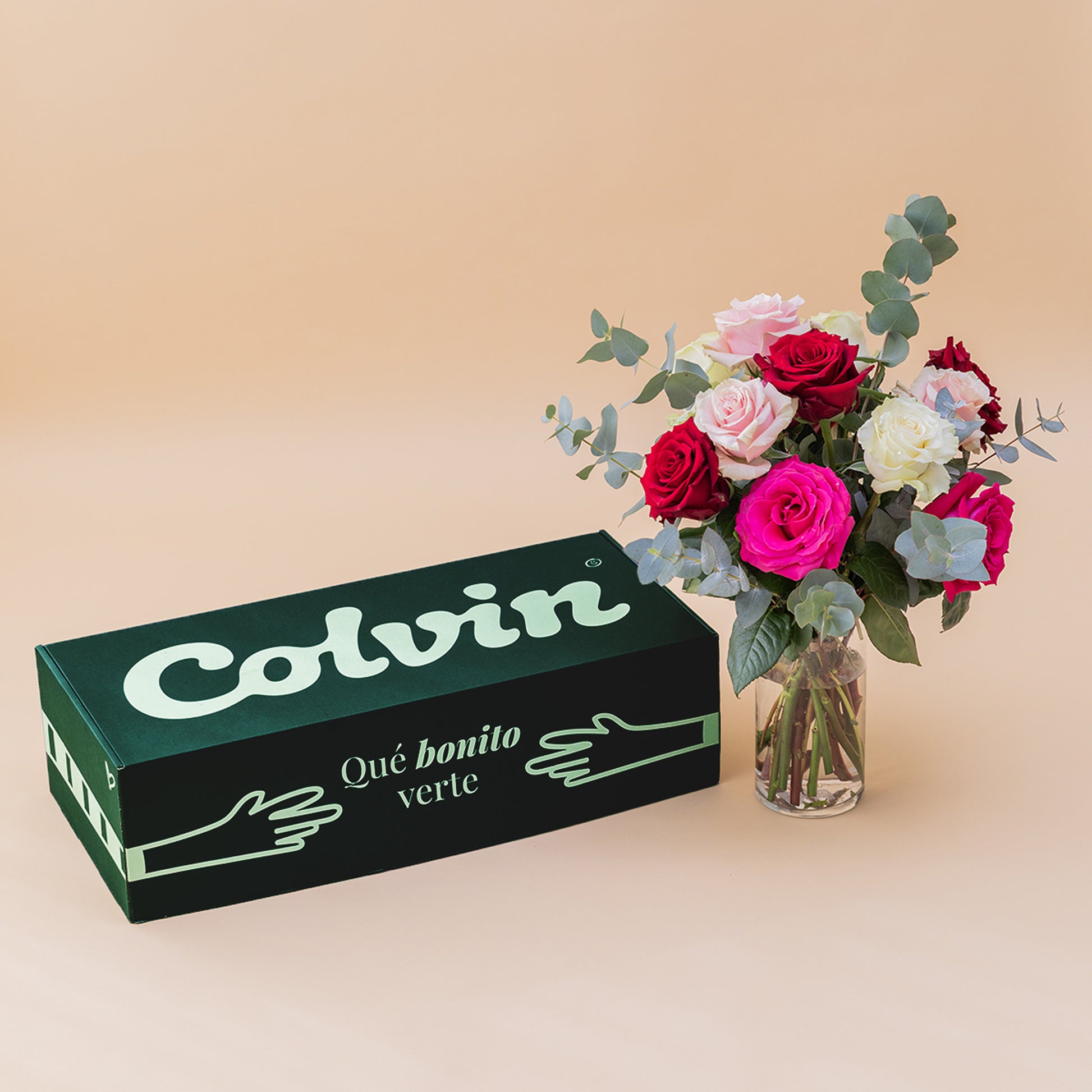 Una selección de rosas en distintos colores acompañadas de eucalipto fresco: bonitas, vibrantes y con ese aire de detalle que alegra cualquier rincón de la casa.