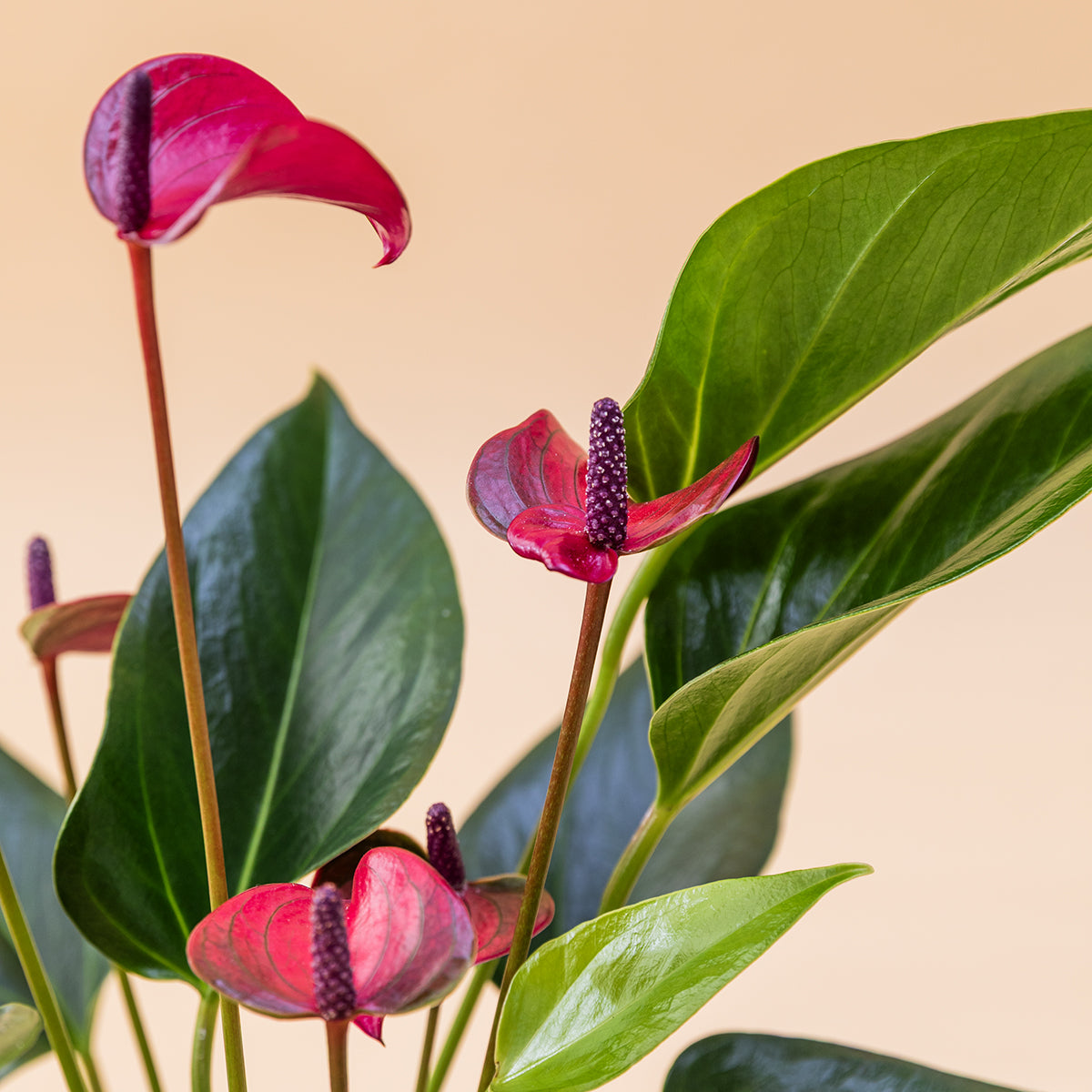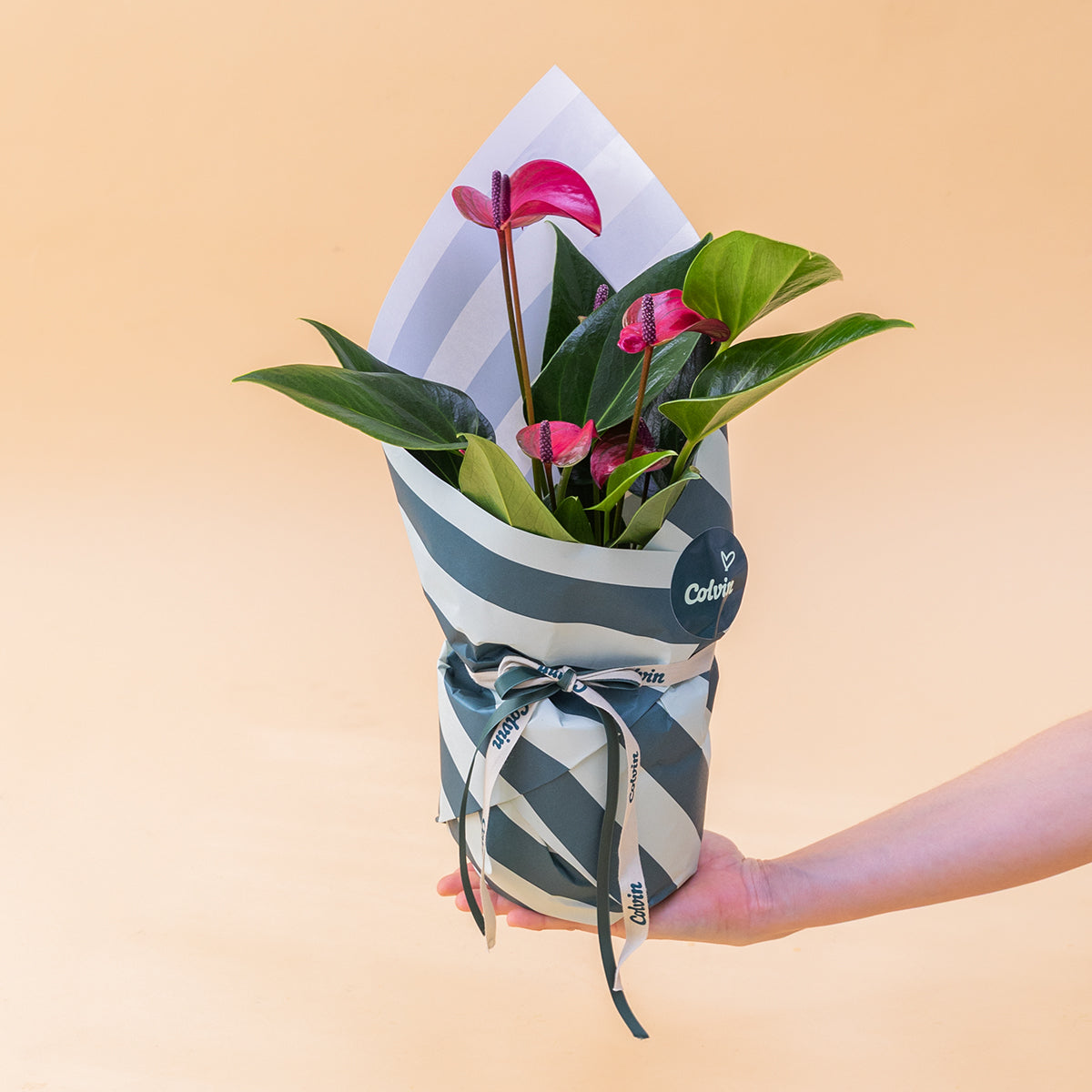 El Anthurium Morado es pura personalidad: su tono morado intenso y esa textura brillante (que parece casi irreal) le dan un rollo moderno que levanta cualquier rincón. Además, es una superviviente nata: pide muy poco y mantiene el color durante muchísimo tiempo.