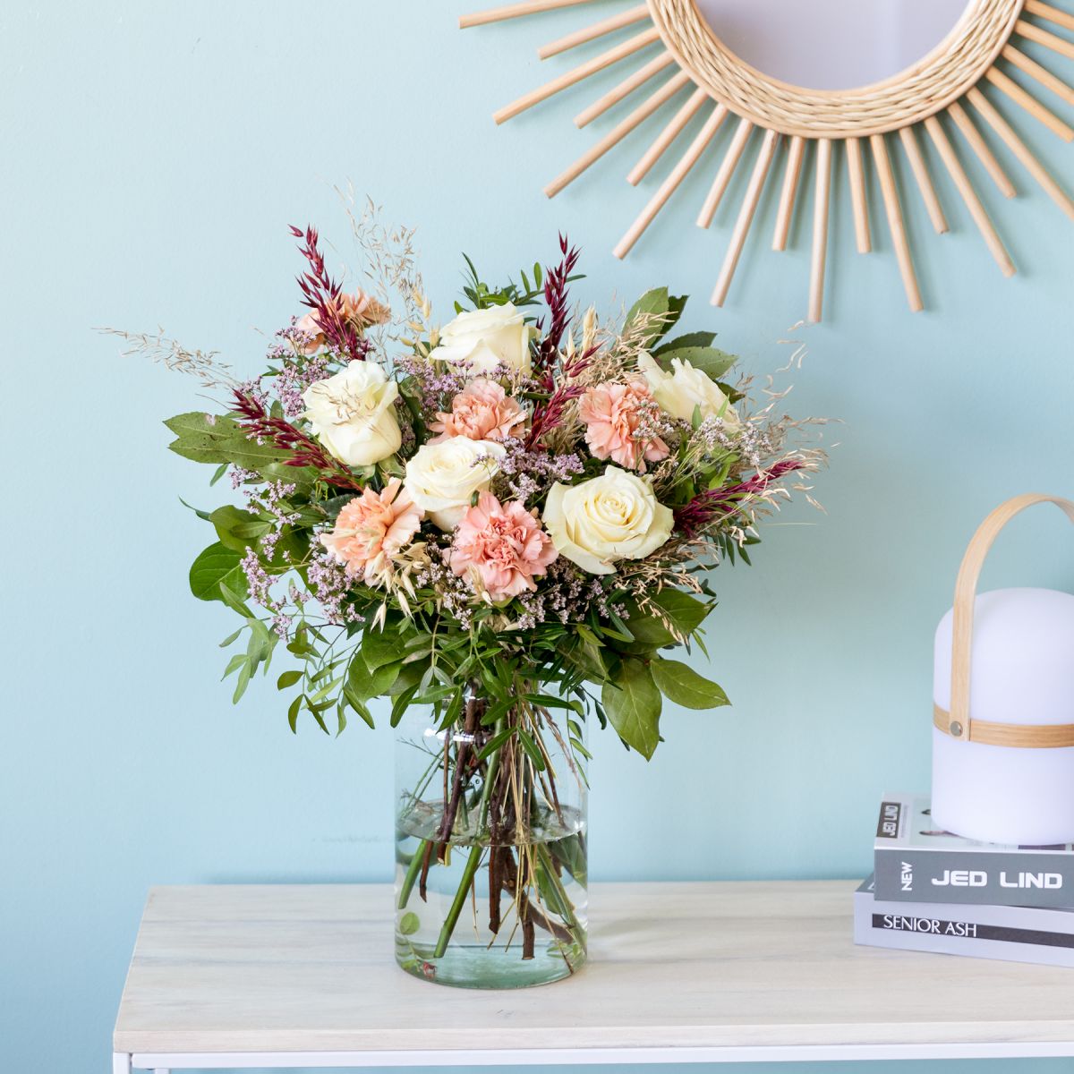 Quando o teu ramo chegar, remova as pétalas externas das rosas. Nós os deixamos para proteger o coração da flor durante a viagem. A composição da parte verde do ramo pode ser ligeiramente diferente da foto.