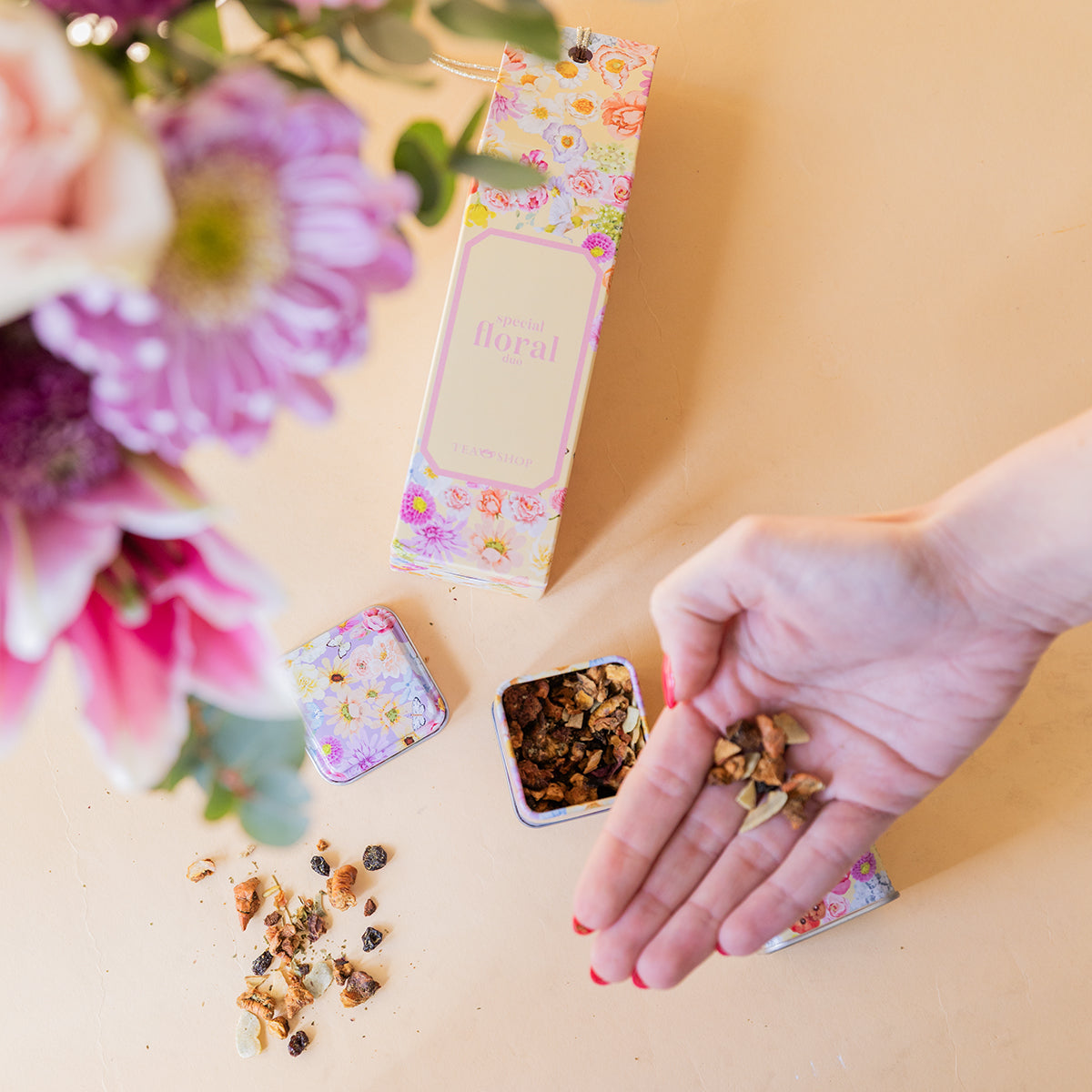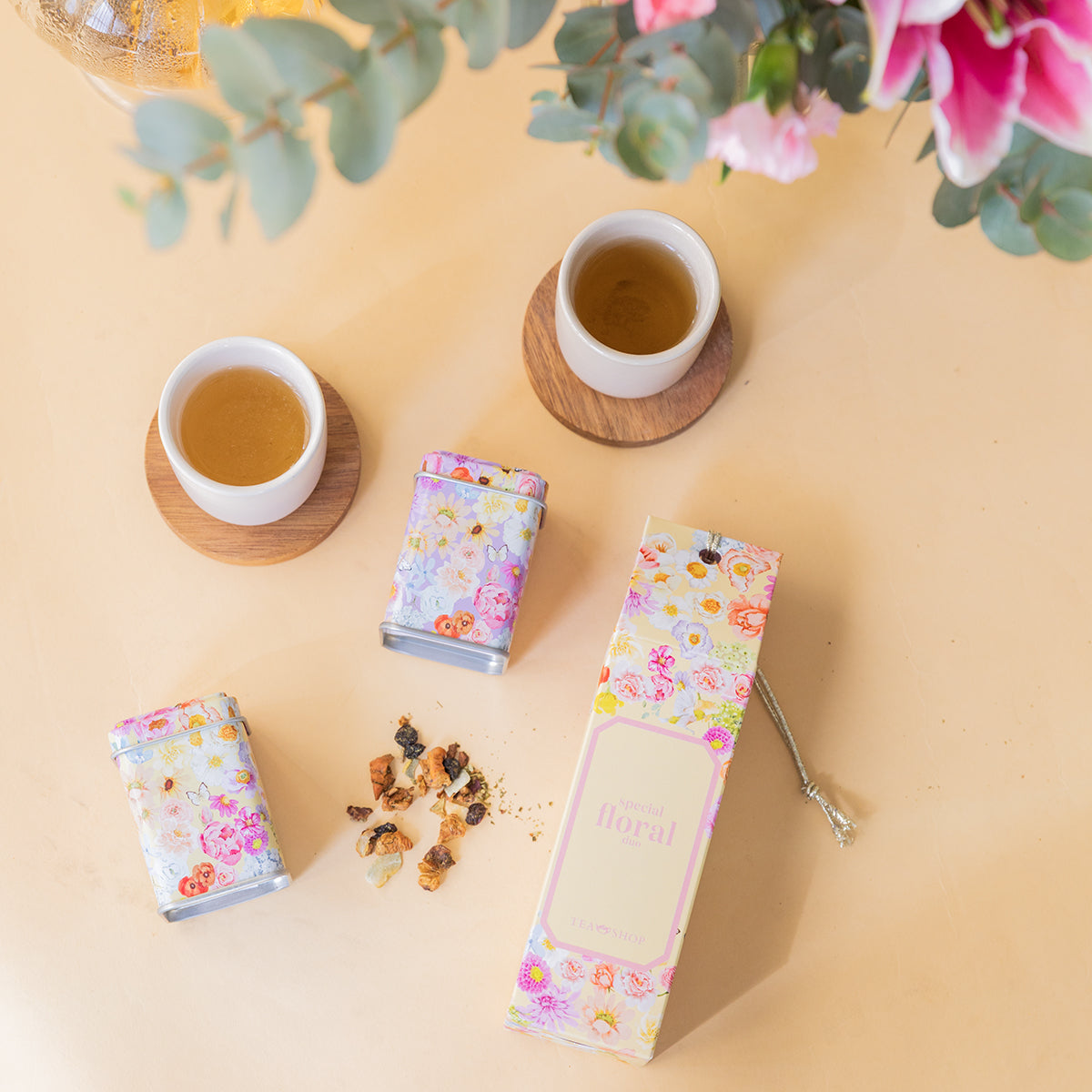 🍵 Conjunto de chás Special Floral Duo: Violet Macaron e Plum Cake.